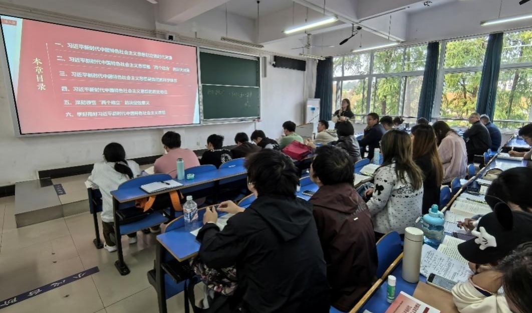 (通讯员 肖苏阳 王惠林)为进一步深化对党的创新理论的理解与把握,提升“习近平新时代中国特色社会主义思想概论”课教学质量,11月3日下午,马克思主义学院“习近平新时代中国特色社会主义思想概论”教研部全体教师走进我院青年教师黄佳琦老师的课堂,开展了一次生动的教学观摩,并在课后进行了集体备课与理论研讨。活动特邀请学校督导高翔莲老师、吴太山老师,学院党委书记魏海勇、副院长孙文沛一同参加。