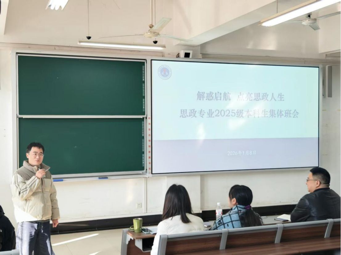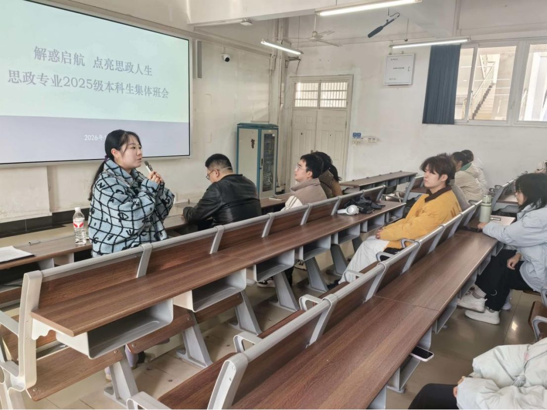 (通讯员:李胜蓝 何晓龙)1月8日上午10时,马克思主义学院思想政治教育系在北区教学综合楼202室举行2025级新生集体班会。本次班会以“解惑启航 点亮思政人生”为主题,旨在引导新生深化专业认知、锚定发展方向。学院副院长陈军、思政领航党支书记曹阳、系主任李胜蓝、副主任何晓龙、2025级班主任及全体本科学生参会。会议由何晓龙主持。