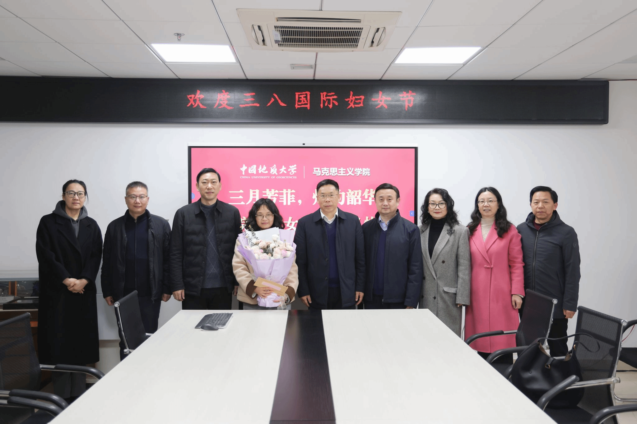 35日上午在第116“三八”国际妇女节到来之际,党委副书记、工会主席王甫一行到访马克思主义学院,代表学校向湖北省第届高校青教赛二等奖获得者王晓南及学院全体女教职工致以节日问候。